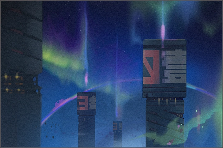 They’re a void that eats the city around them. They’re a towering part of the skyline. There’s even one where no city is present, just strange towers that Hugo also reflects like auroras... And that’s clearly the beauty of them he’d described. The colors that surround the bubbles are vibrant, and he goes through a few mediums to try and convey it. Pencil, pastel, anything colorful enough to convey their strange beauty.